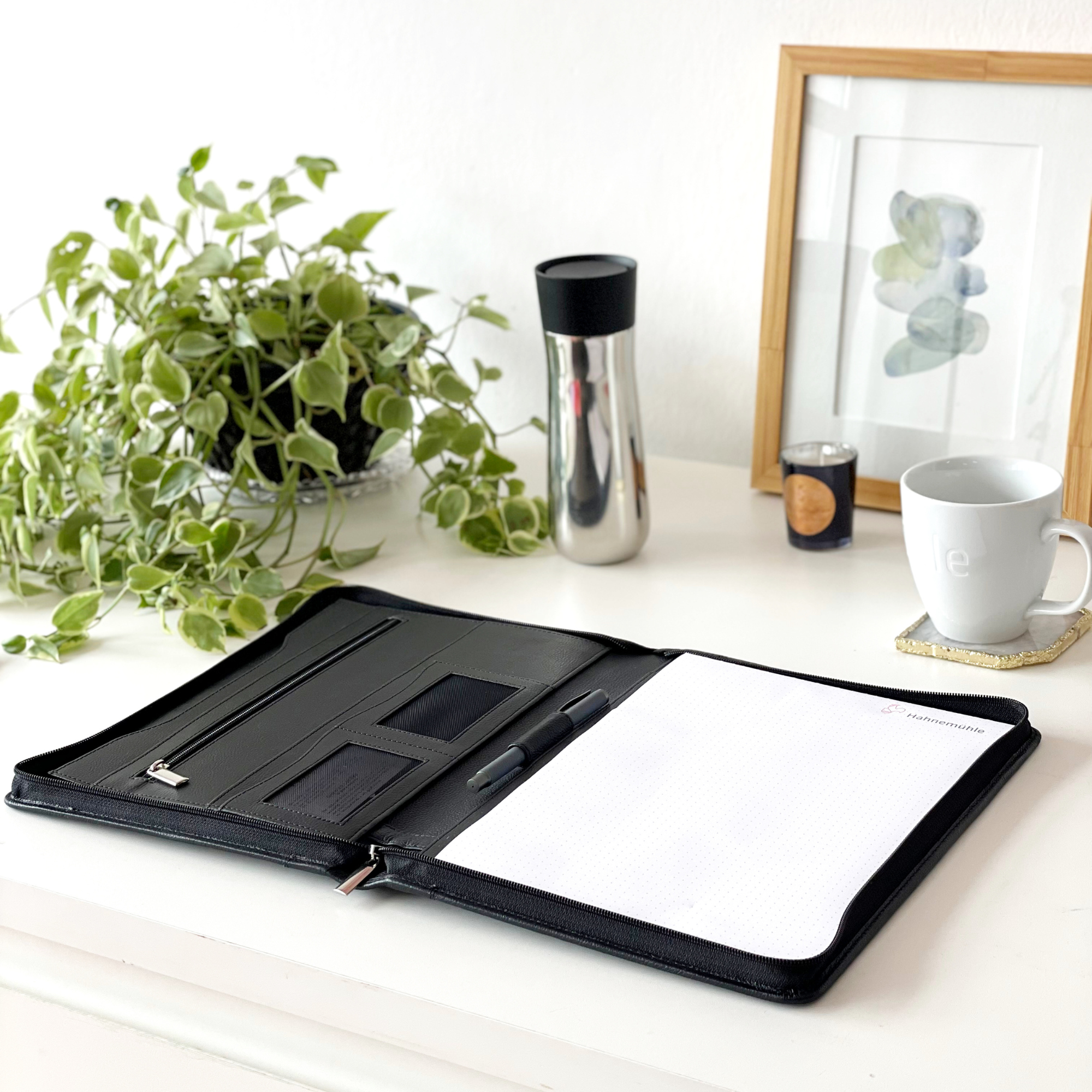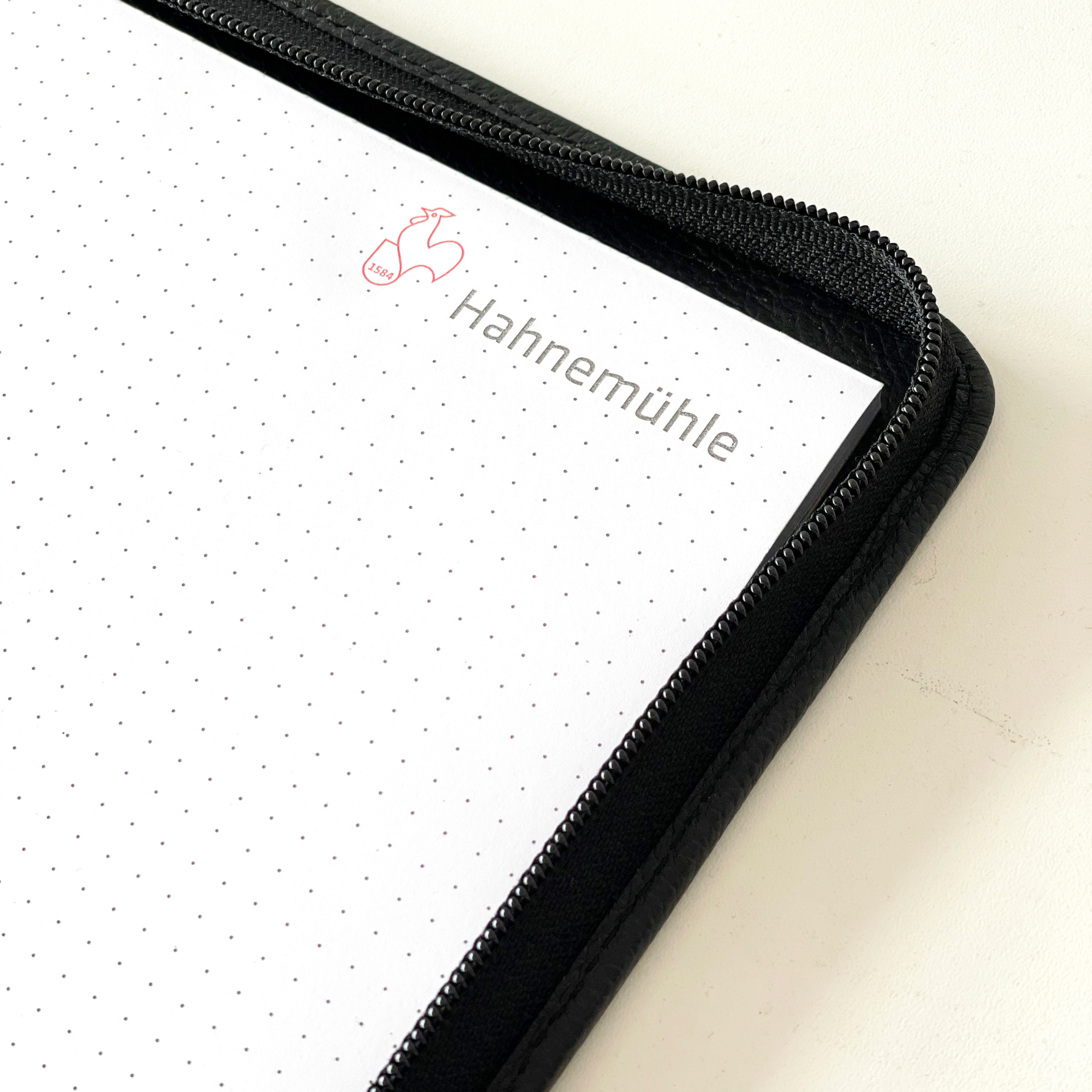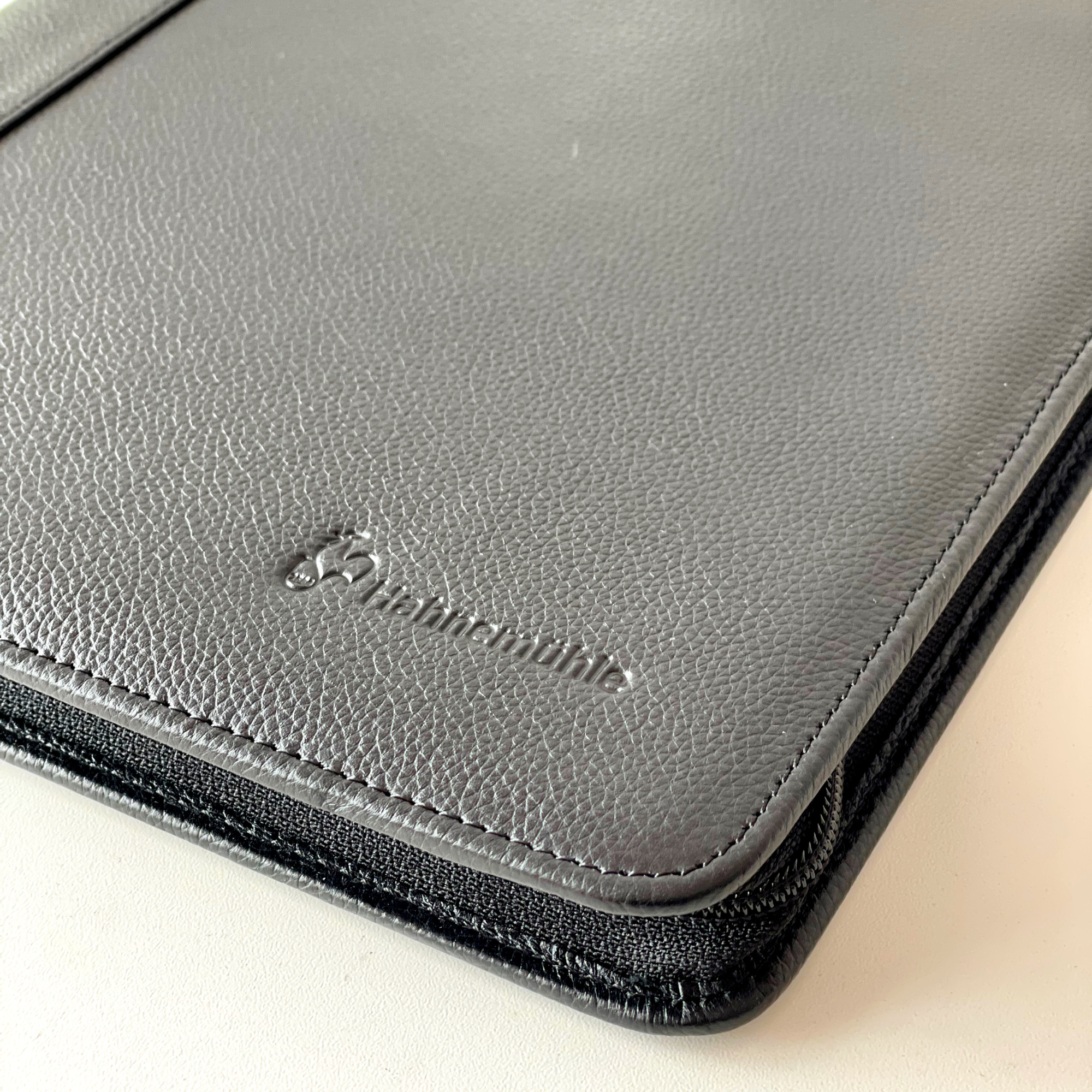 Die repräsentable Mappe für Unterlagen in DIN A 4 ist bereits mit einem Hahnemühle Briefblock und einen Tintenroller ausgestattet. Die Mappe aus Rindsnappaleder hat auf der Vorderseite unten rechts eine edle Hahnemühle-Prägung.