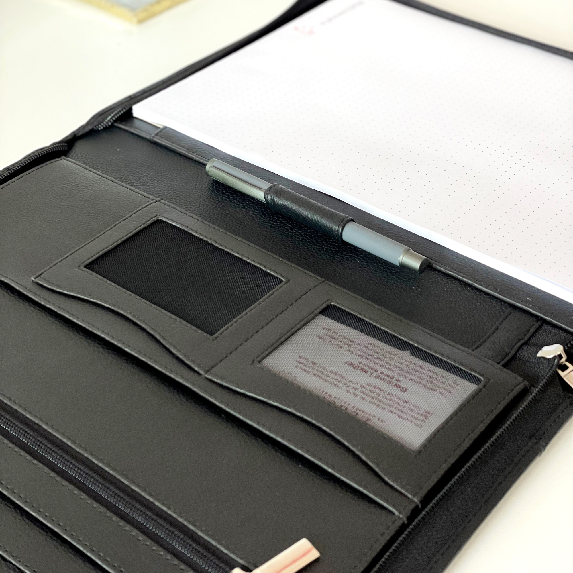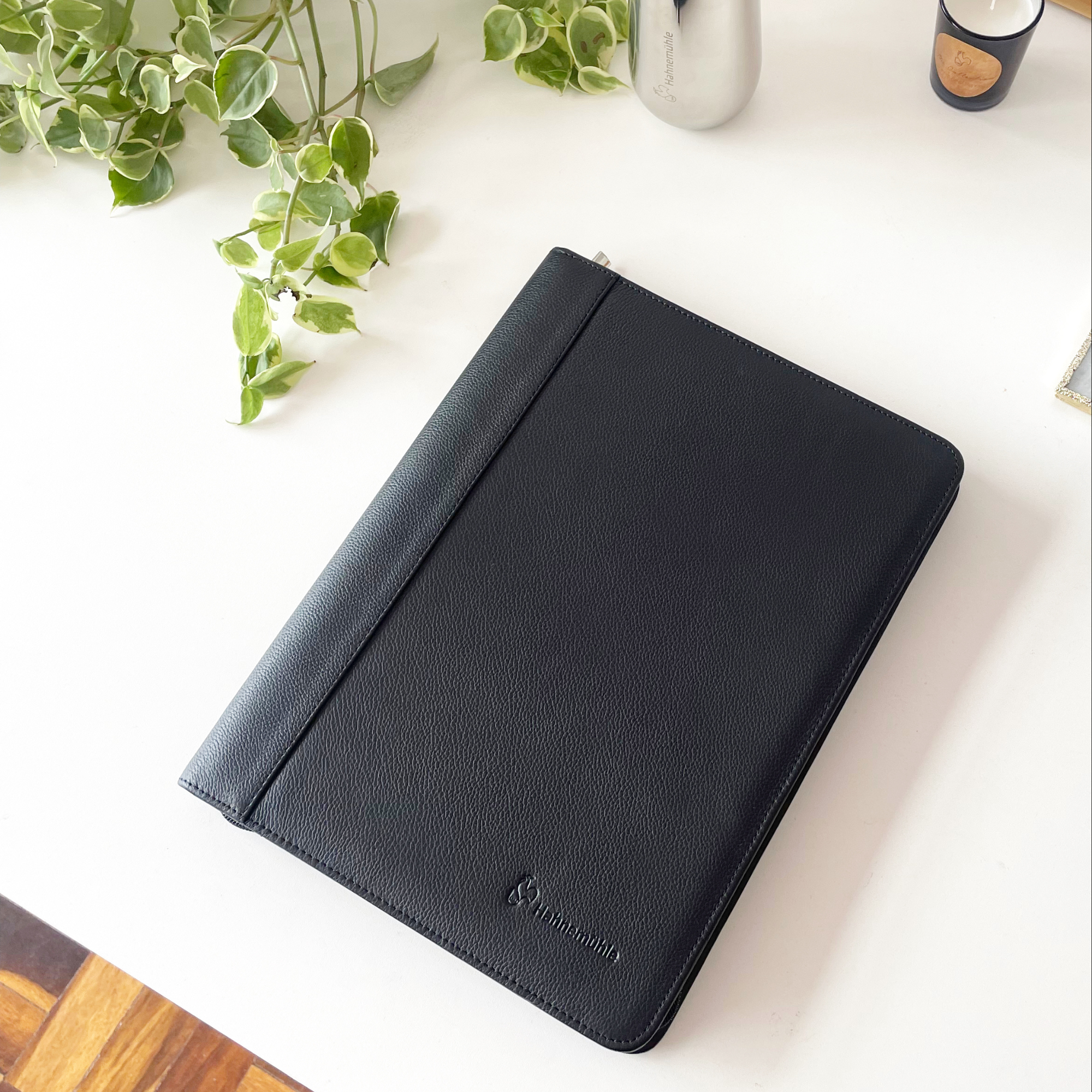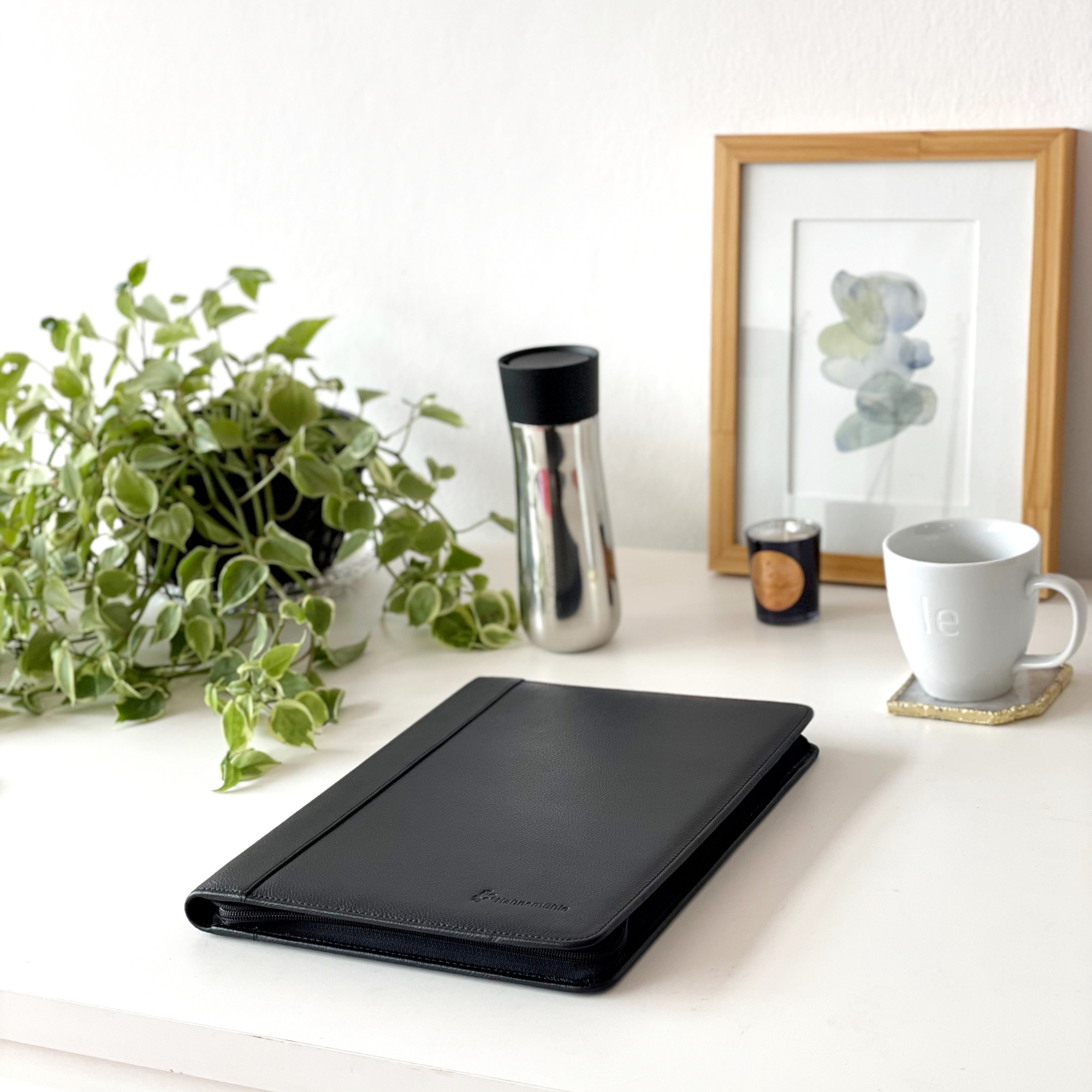 Die repräsentable Mappe für Unterlagen in DIN A 4 ist bereits mit einem Hahnemühle Briefblock und einen Tintenroller ausgestattet. Die Mappe aus Rindsnappaleder hat auf der Vorderseite unten rechts eine edle Hahnemühle-Prägung.