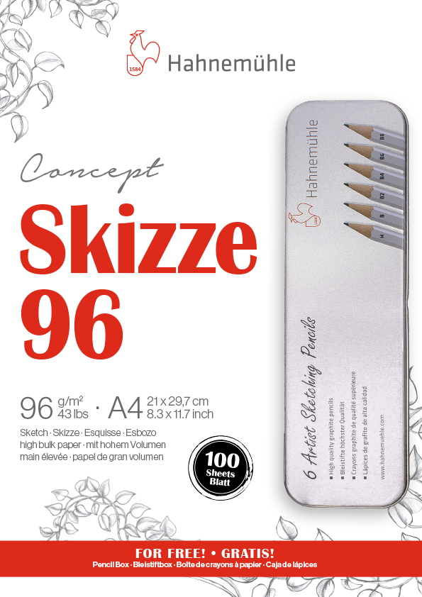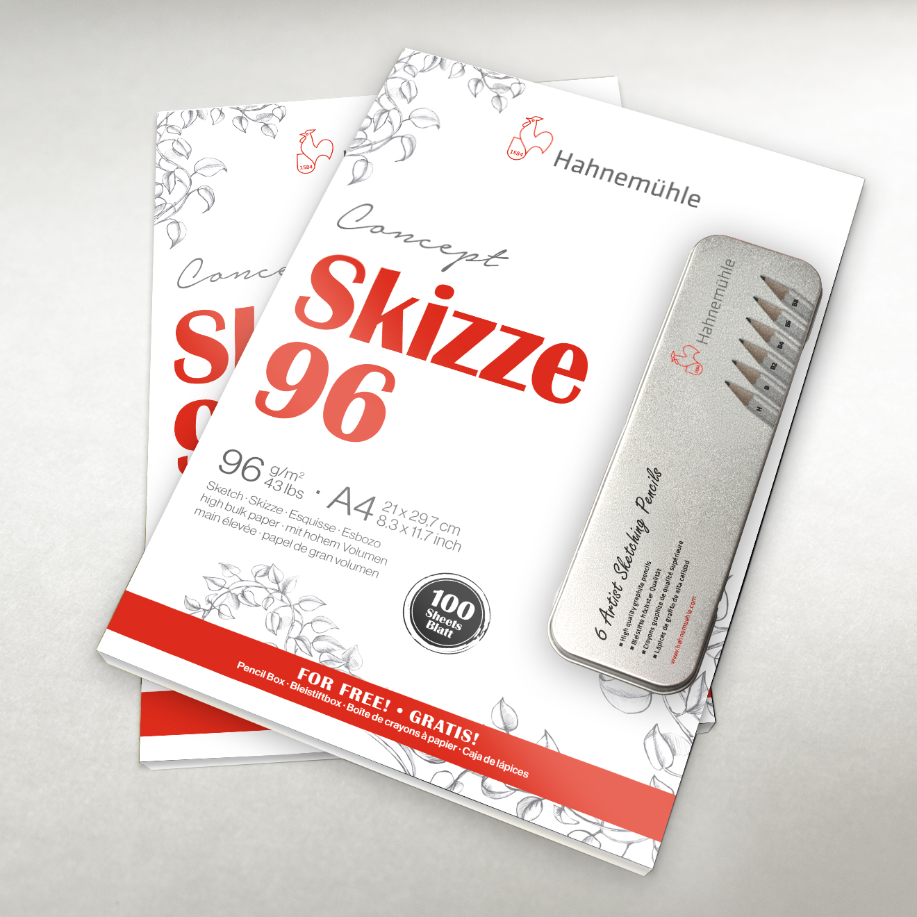 The best-selling sketching paper with a 96 gsm paper is perfect for pencil, charcoal, red chalk, wax crayon or even pastel drawings. Artists love the paper for its softness, which is due to the higher bulk. Skizze 96 gsm has an extremely fine grain and guarantees excellent colour adherence. The white paper, made from 100% wood pulp, is acid free and non-ageing, and therefore the perfect medium for capturing precious memories or memorable moments forever in the form of a drawing or a sketch. The 100-sheet pads have a glued top edge and are available in sizes A4 and A3.