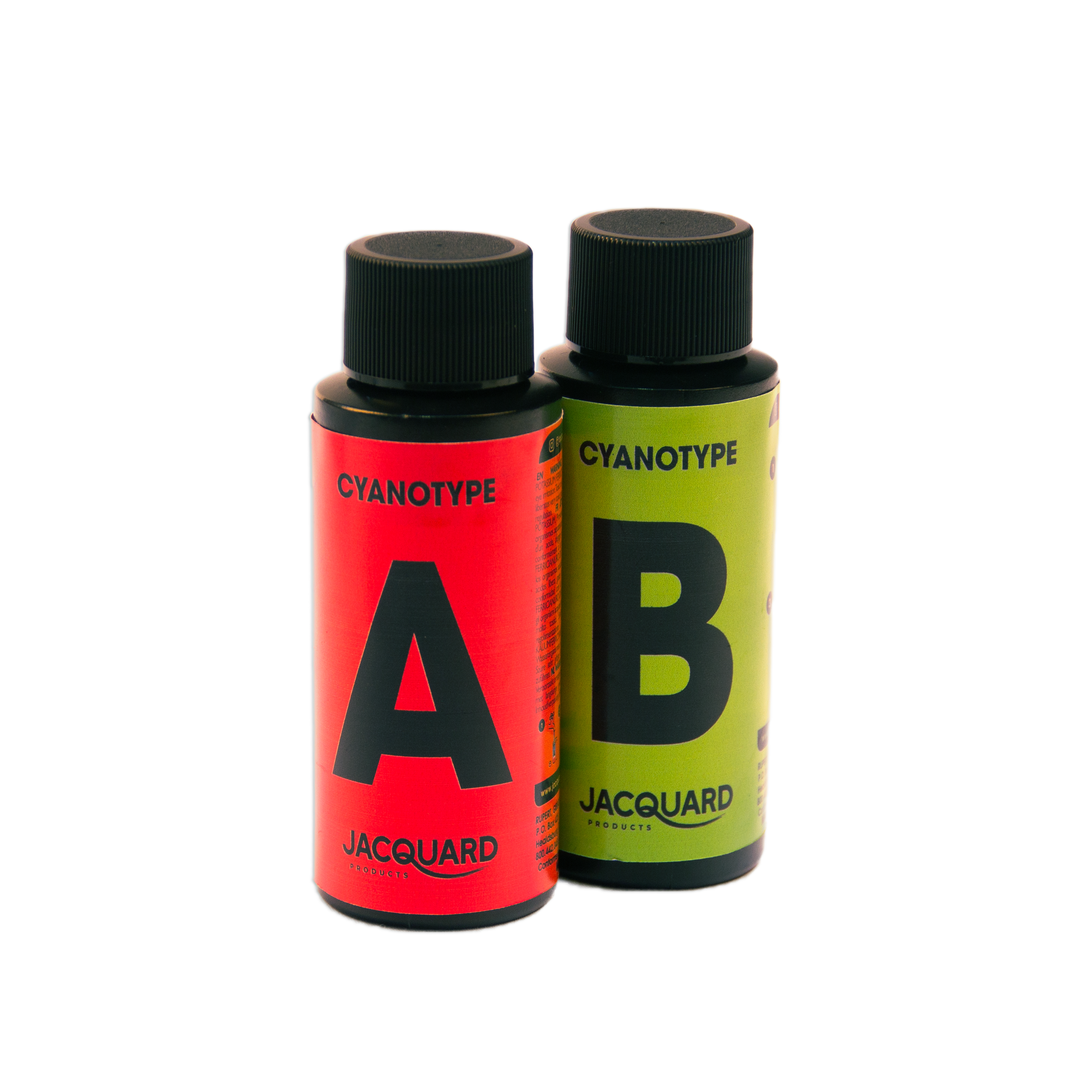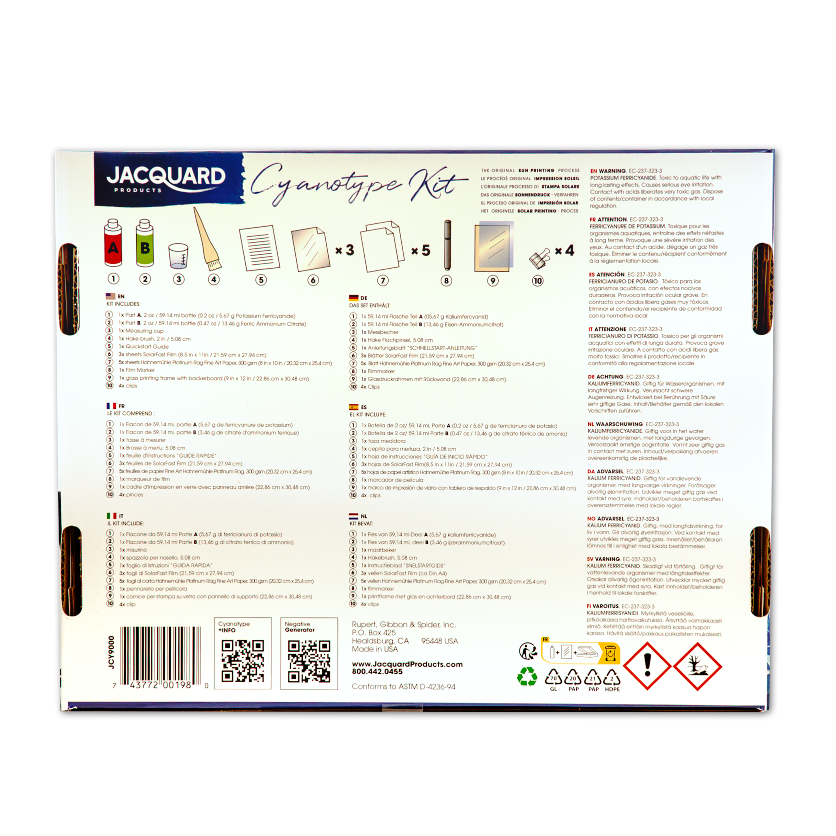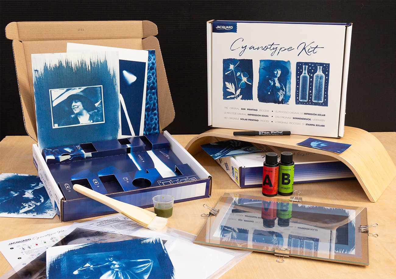 Jacquard’s Cyanotype Kit makes sun printing easier than ever and includes everything you need to get started. The chemistry comes premeasured in lightproof black bottles. Simply fill each bottle with water to create Stock Solutions A & B, and then mix the two in equal parts to create the cyanotype sensitizer. Coat the included Hahnemühle Platinum Rag Fine Art Paper with the sensitizer and, once dry, create prints by exposing to sunlight or UV (10-20 minutes, depending on conditions), using the included glass printing frame and objects or a film negative to create an image. After exposure, prints are processed in a tray of cool water and allowed to air dry. The kit comes with enough material to make at least 12 (8.5x11in/ 21.59 x 27.94cm) prints. Multi-lingual packaging is compliant in 15+ countries.